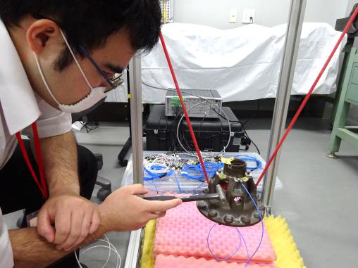 加速度センサーを取り付けて、インパクトハンマーで加振を行います。