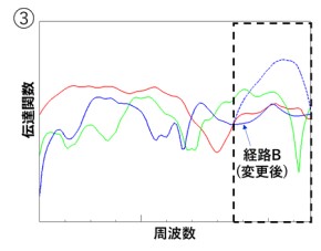 実機での形状変更や制振材追加などの対策を想定し、ピーク値を下げる計算手法を用いて目標値を満足する伝達関数を求めました。(グラフ③ 青実線)
