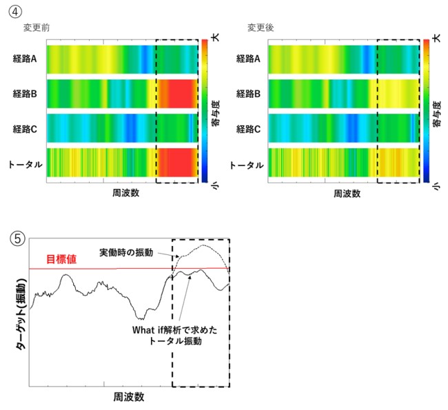変更した伝達関数を用いたWhat if解析を行うと経路Bの寄与が下がり(グラフ④)、トータル振動も目標値を満足したことが分かります。(グラフ⑤)