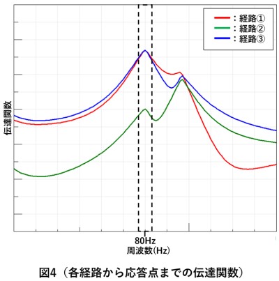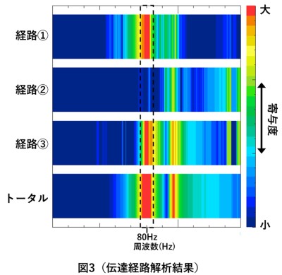 下記伝達経路解析結果から、80Hz付近では経路①③の寄与度が大きいことを確認できます。