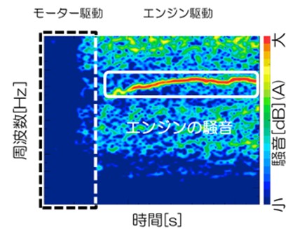 エンジンで走行する領域はエンジンの爆発によって発生する周波数で騒音が確認できますが、モーターのみで走行する領域では同じ周波数で騒音が発生していないことがわかります。