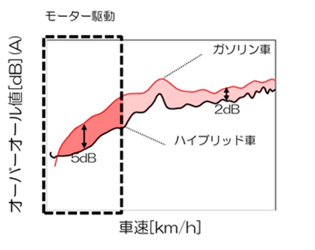 ハイブリッド車がガソリン車と比較して静かであり、中でもモーターのみで走行する領域は約5dBの差があることがわかります。