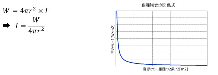 球面波の場合、音源からr[m]離れた位置での音のパワーと強さの関係は以下の式で表され、音の強さは距離の2乗に反比例する形で減衰します。