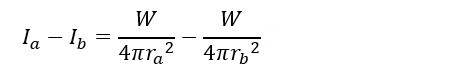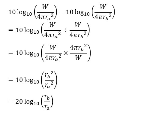音源の音のエネルギーをW[W]とし、2つの測定点をそれぞれ音源からra[m]、rb[m](ra