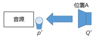 ②音源位置にマイクロフォンを設置し、位置Aから音響加振した時の音を測定