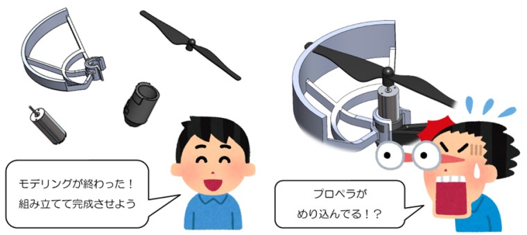 逆に、完成形状がイメージできていない状態で「ボトムアップ設計」による設計を進めると、設計の最終段階まで部品同士の干渉に気づくことができず、大きな手戻りになってしまいます。