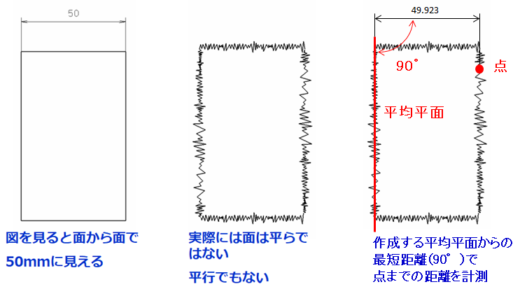 この点群のバタつきが大きい3Dスキャナの場合、測定において平均面を作成する際、本来の位置に面が作成できない可能性が高く、結果として測定時の精度が悪くなってしまいます。