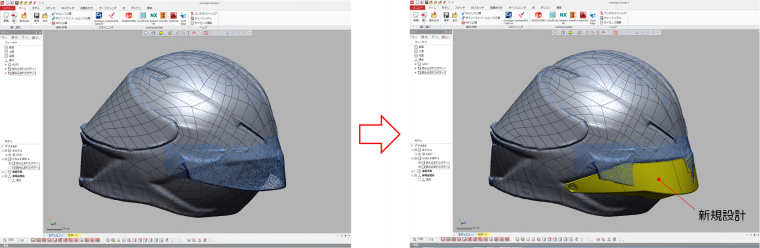 位置合わせ後の①のSTLデータと③のオートサーフェスデータをGeomagic DesignXで取込み、③のデータを用いながら①の段ボール フィン形状を再現していきます。段ボール フィン形状はガムテープでヘルメットへ固定しているので、ヘルメットへのボルト取付け方法も考えながらしっかりと設計していきます。