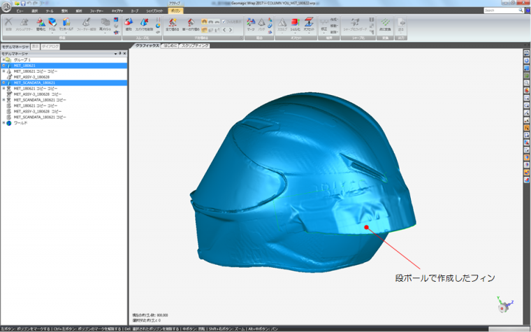 風洞実験中に段ボールで簡易的に作成したフィン形状ですが、ヘルメットとASSY状態でスキャンしました。又、従来から取付いていたフィンを外したヘルメットのみをスキャンしました。