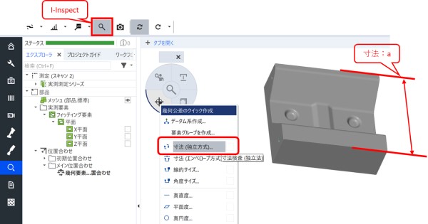 I-Inspectの左下の「幾何公差のクイック作成」の一覧から「寸法(独立方式)」をクリックします。